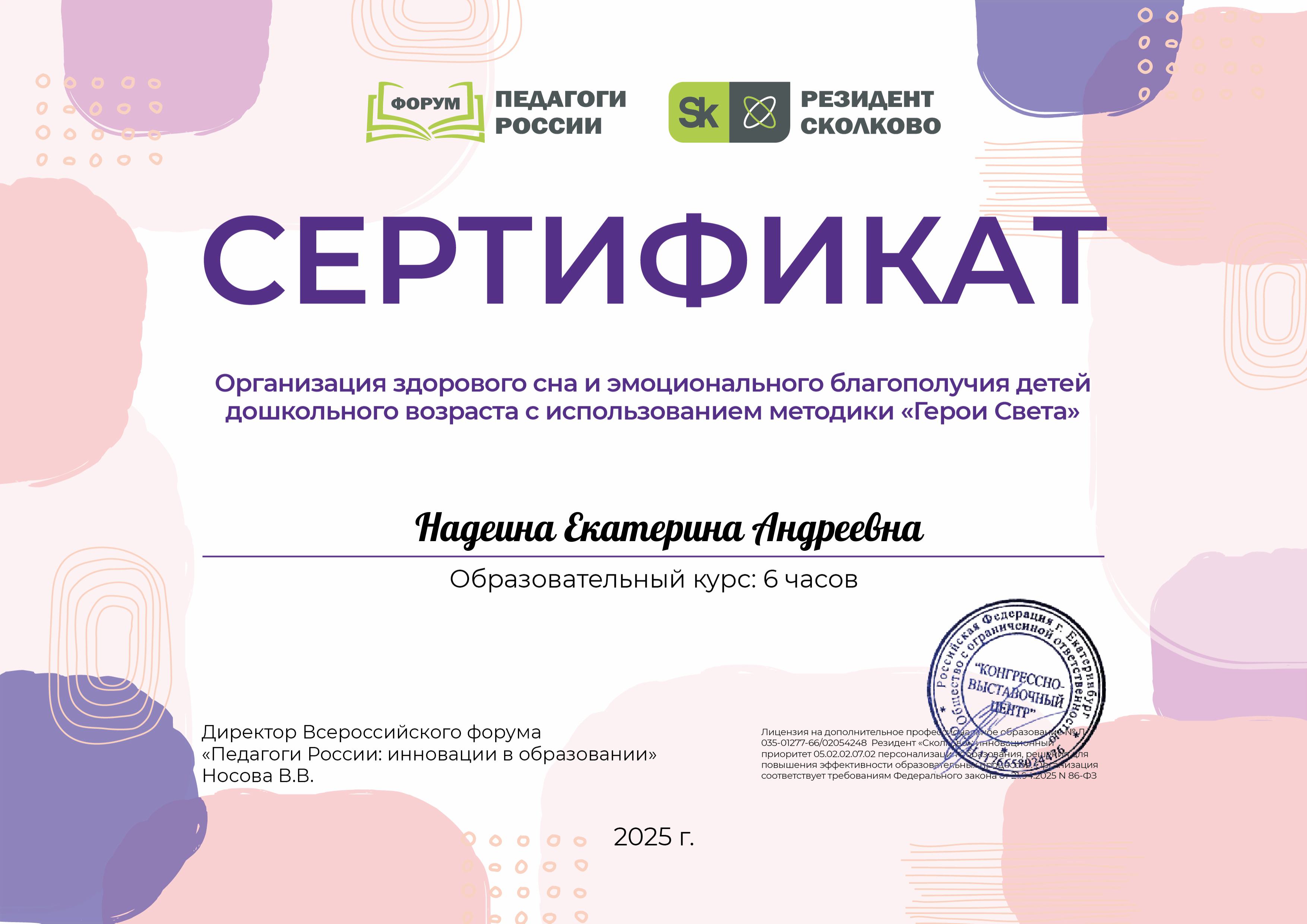 Сертификат "Организация здорового сна и эмоционального благополучия детей дошкольного возраста с использованием методики "Герои Света", 2025 год