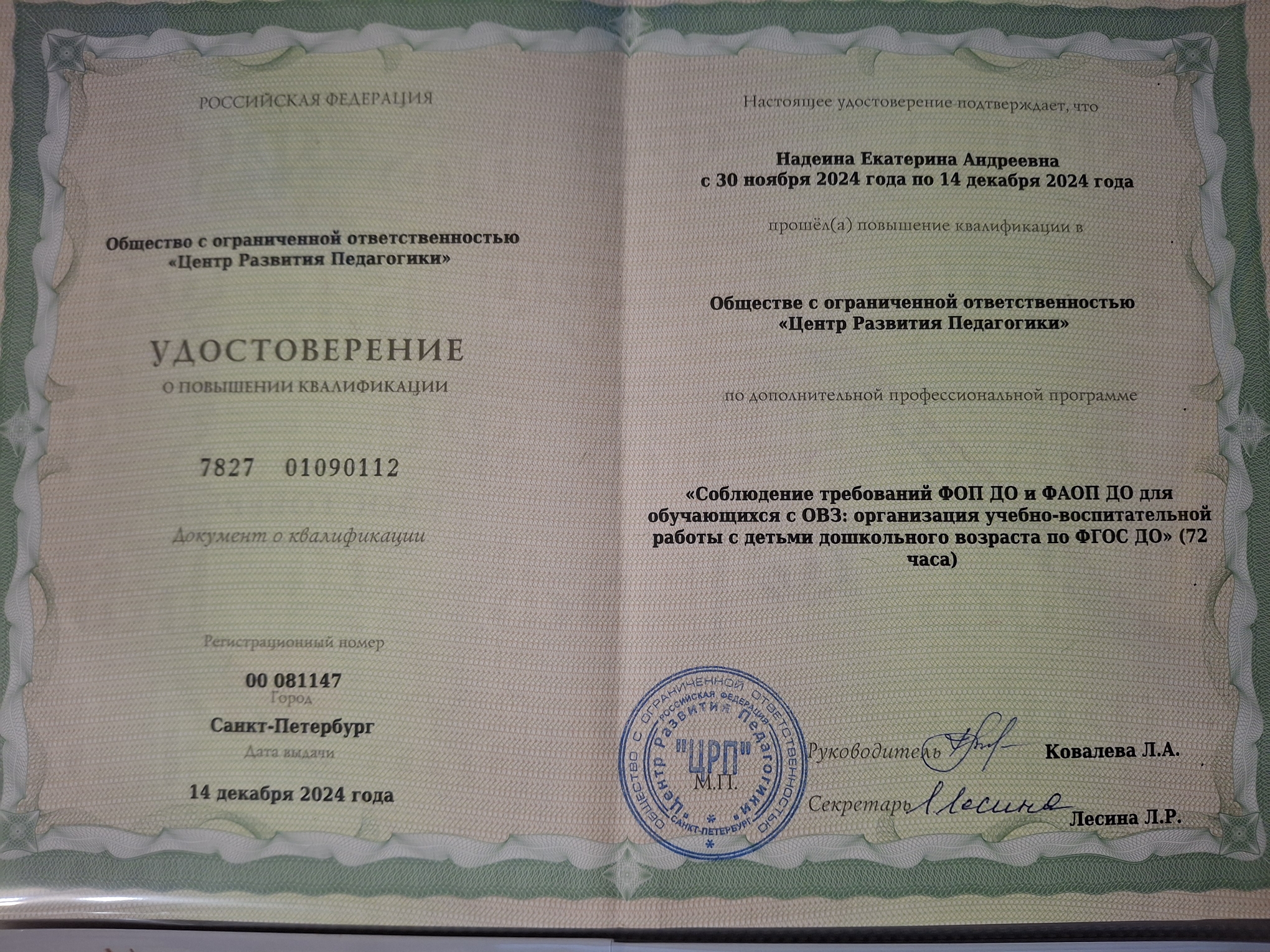 Удостоверение о повышении квалификации по дополнительной профессиональной программе "Соблюдение требований ФОП ДО и ФАОП ДО для обучающихся с ОВЗ: организация учебно - воспитательной работы с детьми дошкольного возраста по ФГОС ДО"