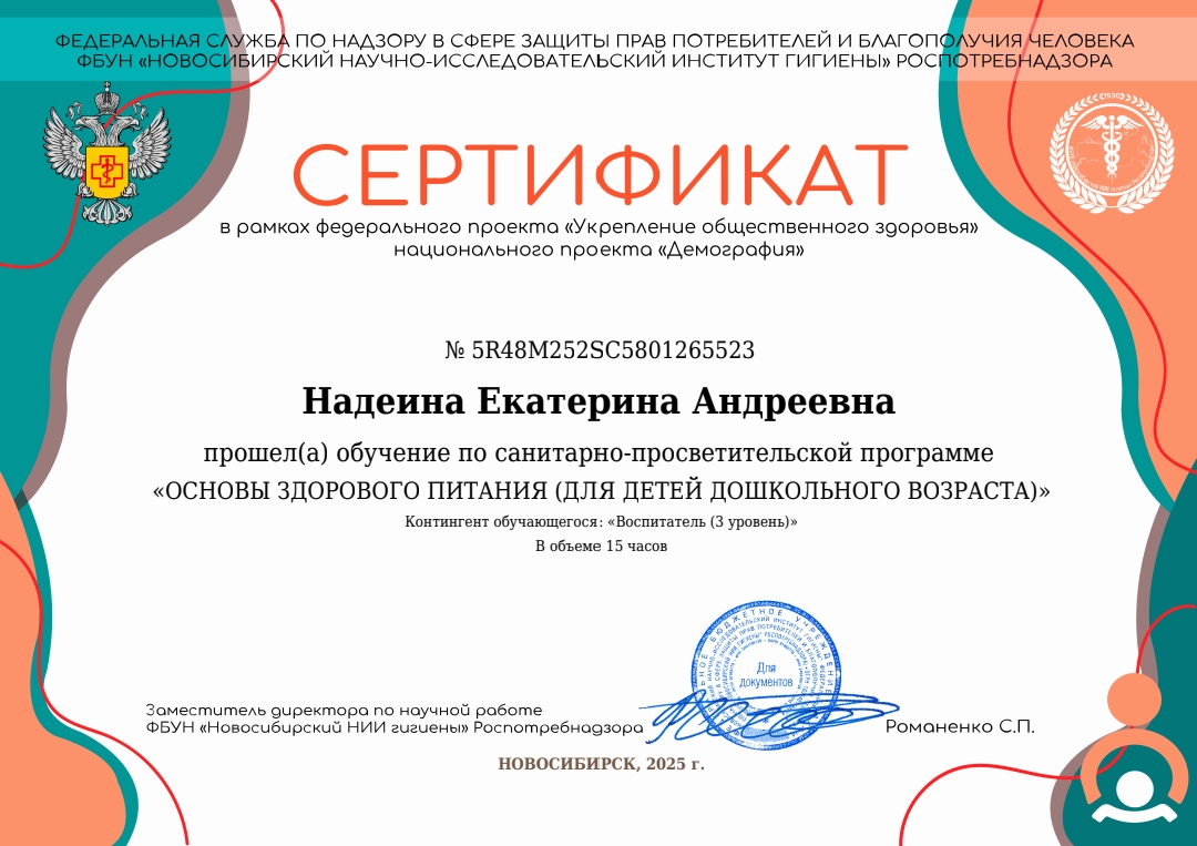 Сертификат обучения по саниатрно - просветительской программе "Основе здорового питания (детей дошкольного возраста)" 2025 год