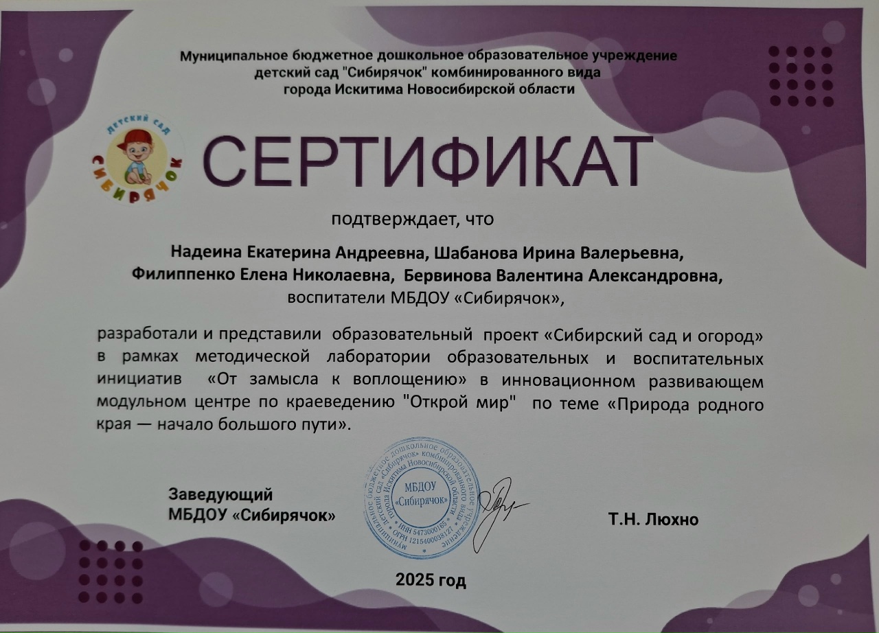 Сертификат Разработали и представили образовательный проект "Сибирский сад и огород" в рамках методической лаборатории образовательных и воспитательных инициатив "От замысла к воплощению", 2025 год