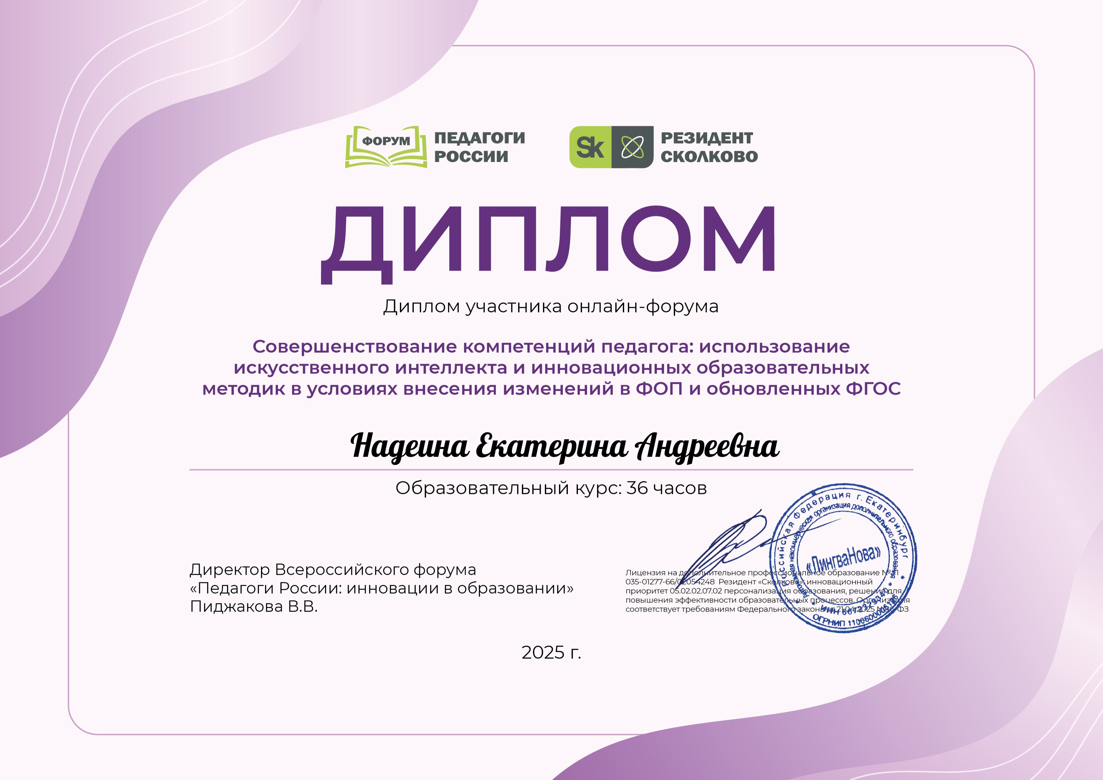 Диплом участника онлайн- форума "Совершенствование компетенций педагога: использование исскуственного интелекта и инновационных образовательных методик в условиях внесения изменений в ФОП и обновленных ФГОС", 2025 год