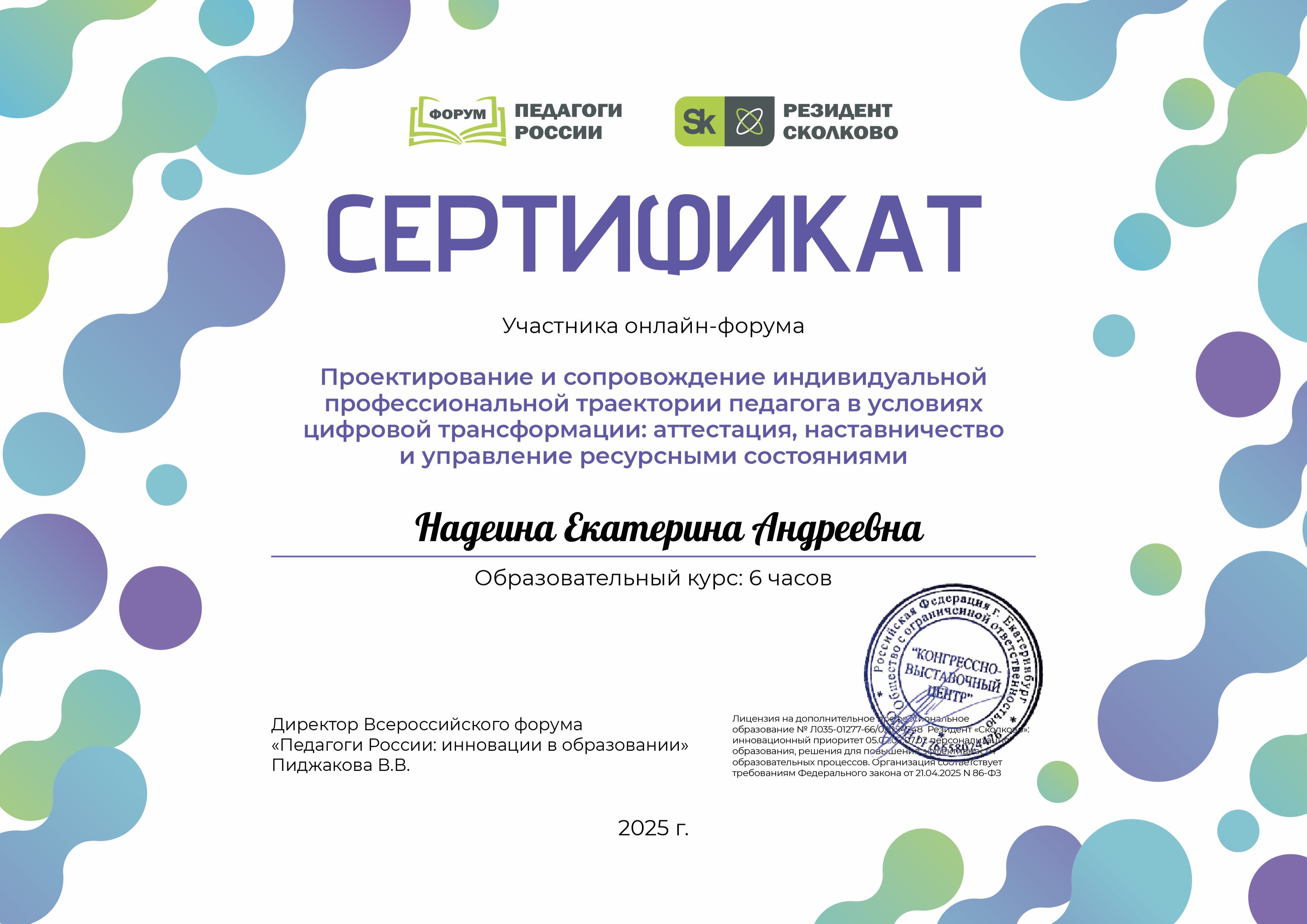 Сертификат участника онлайн - форума "Проектирование и сопровождение индивидуальной профессиональной траектории педагога в условиях цифровой трансформации: аттестация, наставничество и управление ресурсными состояниями", 2025 год