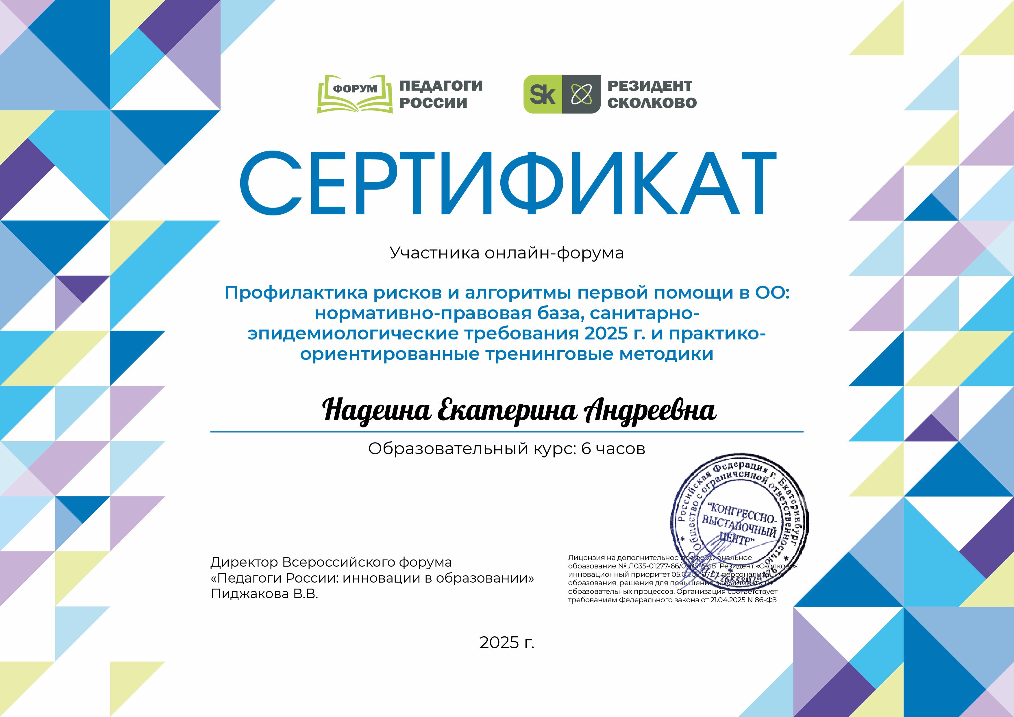 Сетификат участника онлайн - форума "Профилактика рисков и алгоритмы первой помощи в ОО: нормативно - правовая база, санитарно-эпидимиологические требования 2025 г. и практико - ориентированные тренинговые методики", 2025 год